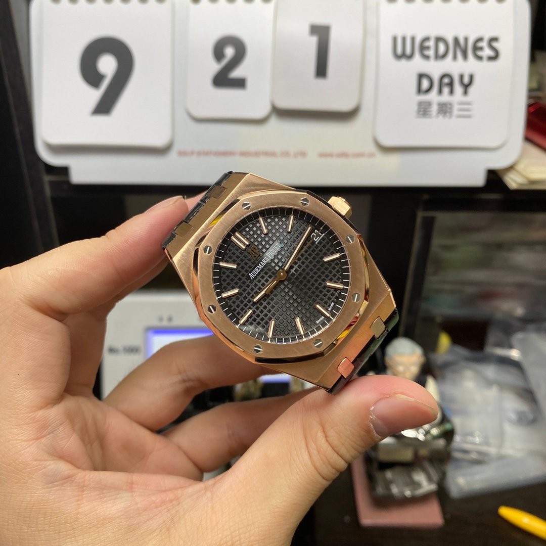 AudemarsPiguetRoyalOakOffshoreSeries15500OR.OO.D002CR.01,RoseGoldCaseBlackDialLeatherStrap,41mmSize.