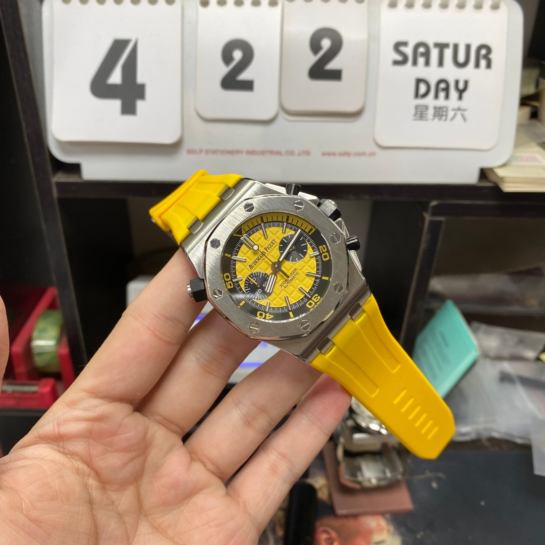 ·DialMaterial:BrightYellowdialwith”MégaTapisserie”oversizedpattern,blacksub-dials,whitegoldluminescenthourmarkers,andRoyalOakhands.Blackrotatinginnerbezelwithdivingscaleandbrightyellow60to15-minutezone.