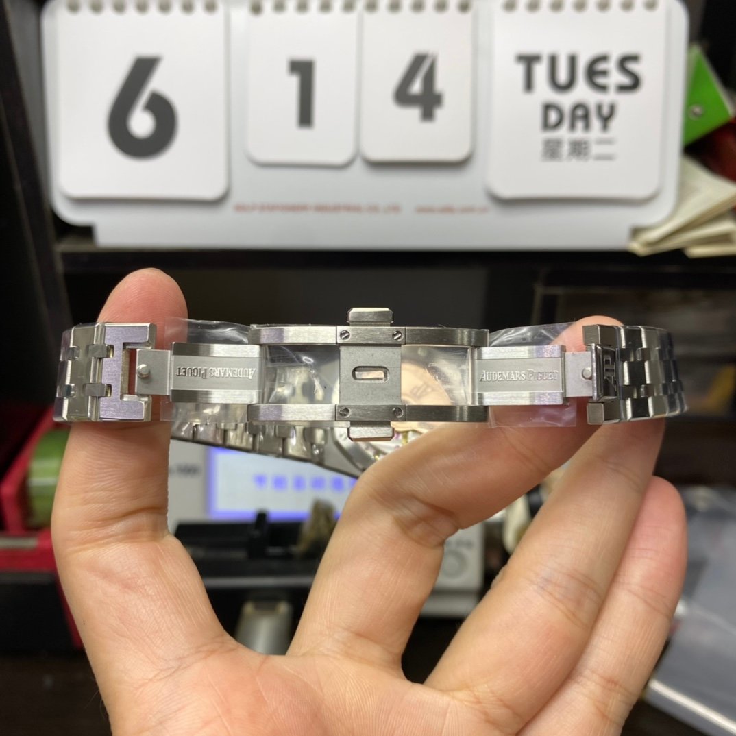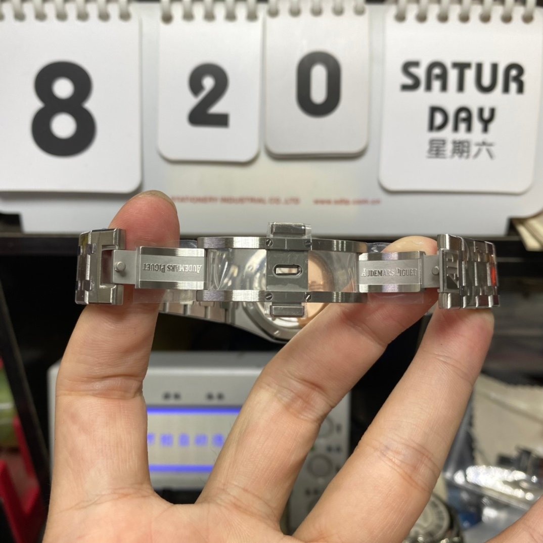 ·DialMaterial:”NightBlue,Cloud50″dialwith”GrandeTapisserie”largegridpatterndecoration,featuringwhitegoldluminescentappliedhourmarkersandRoyalOakhands.