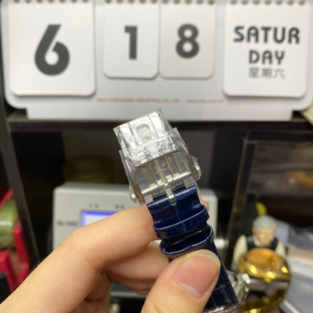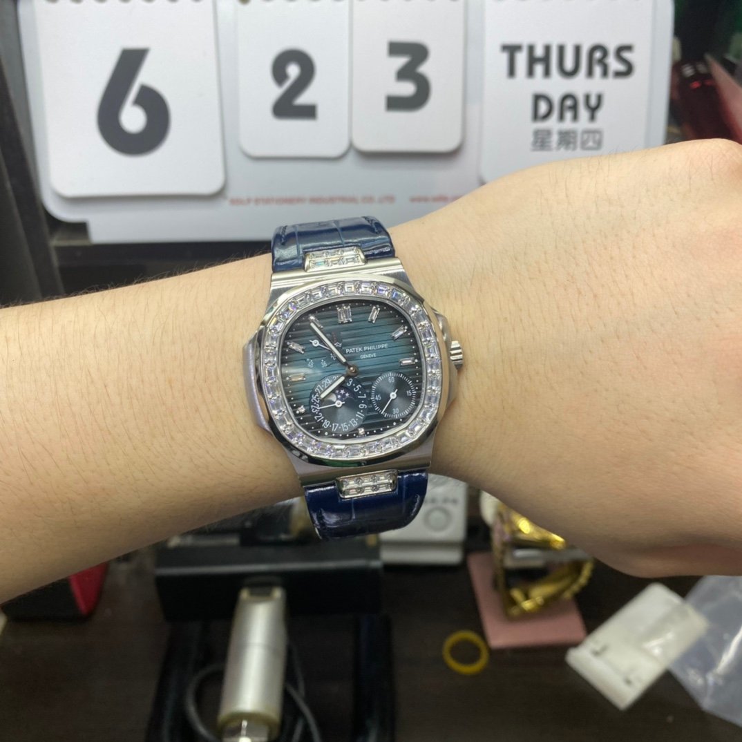 PatekPhilippeNautilusseries5724G-001,SquareDiamondBezelBlueDialBlueLeatherStrap,40mmsize.